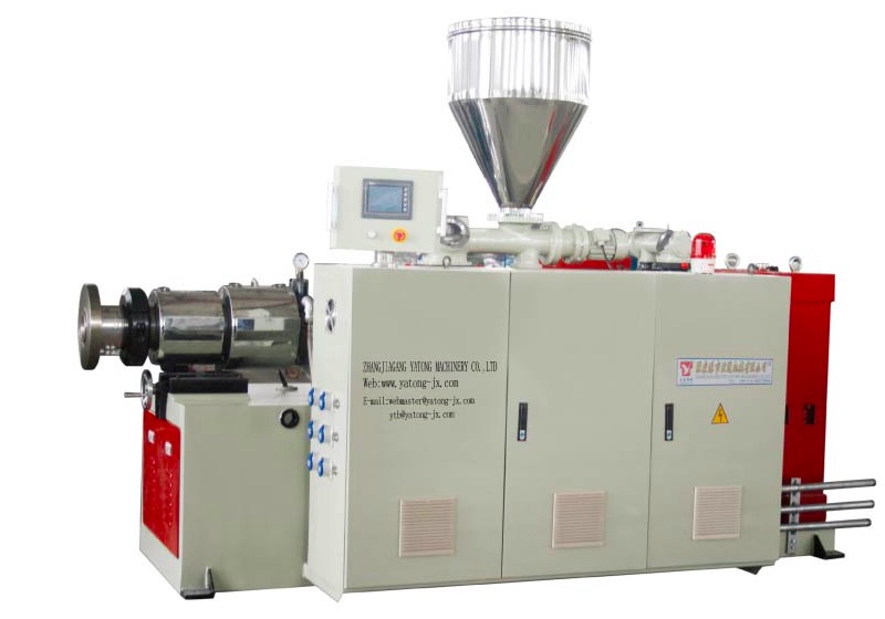 SJSZ系列錐形雙螺桿擠出機,是一種適用于PVC粉料擠出成形的專用設備,配用不同模具及各類輔機就能生產出各類PVC材料的管材、異型材、板材、片材、棒材及造拉。塑化混煉均勻,產量高,適用范圍廣,穩定性好。減速箱、分配箱特殊設計,加固了推力軸承,傳動扭距大、使用壽命長。電控采用PLC/PC自動控制,常規設備采用溫度表控制,主要部分采用進口元器件,并具有多項故障報警功能,操作簡單、維修方便等優點。